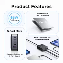 Say goodbye to juggling multiple chargers and tangled cables. This 65W GaN Fast Charger is your all-in-one power solution for phones, tablets, laptops, and more. With advanced GaN technology, it delivers high-speed, efficient charging in a compact, sleek design—perfect for home, office, or travel. Featuring 5 versatile ports, including USB-C and USB-A, it can charge multiple devices at once without compromising on speed.