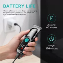 This hair clipper is equipped with everything you need for professional results. The stainless steel R-shaped blade ensures safe trimming without irritating the skin, while the compact, lightweight design makes it easy to maneuver. The cordless functionality and USB rechargeability allow you to groom anywhere without being tied to a power outlet. The LED display keeps you informed about battery life, ensuring you never run out mid-trim. Four precision guide combs (1mm, 2mm, 3mm, 4mm) let you achieve your ideal length effortlessly.